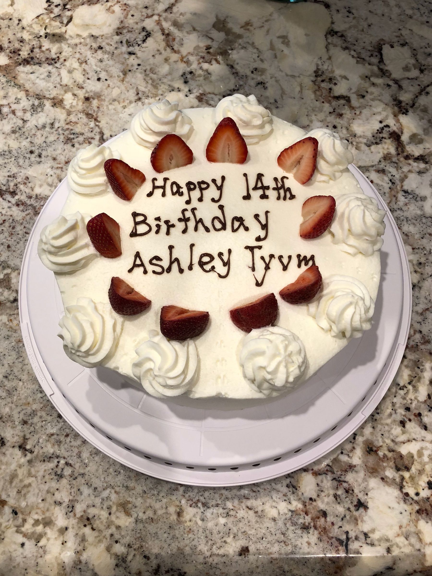 It’s become something of a tradition to order her a whole cake for her birthday and this year was no exception. This isn’t something they normally do so requests must be made well in advance. When my wife sent the text asking for the cake she included the message she wanted written on the top and ended it with tyvm (as in thank you very much). Apparently the distinction was lost as they included that on the cake as well as the message to the amusement of all concerned.