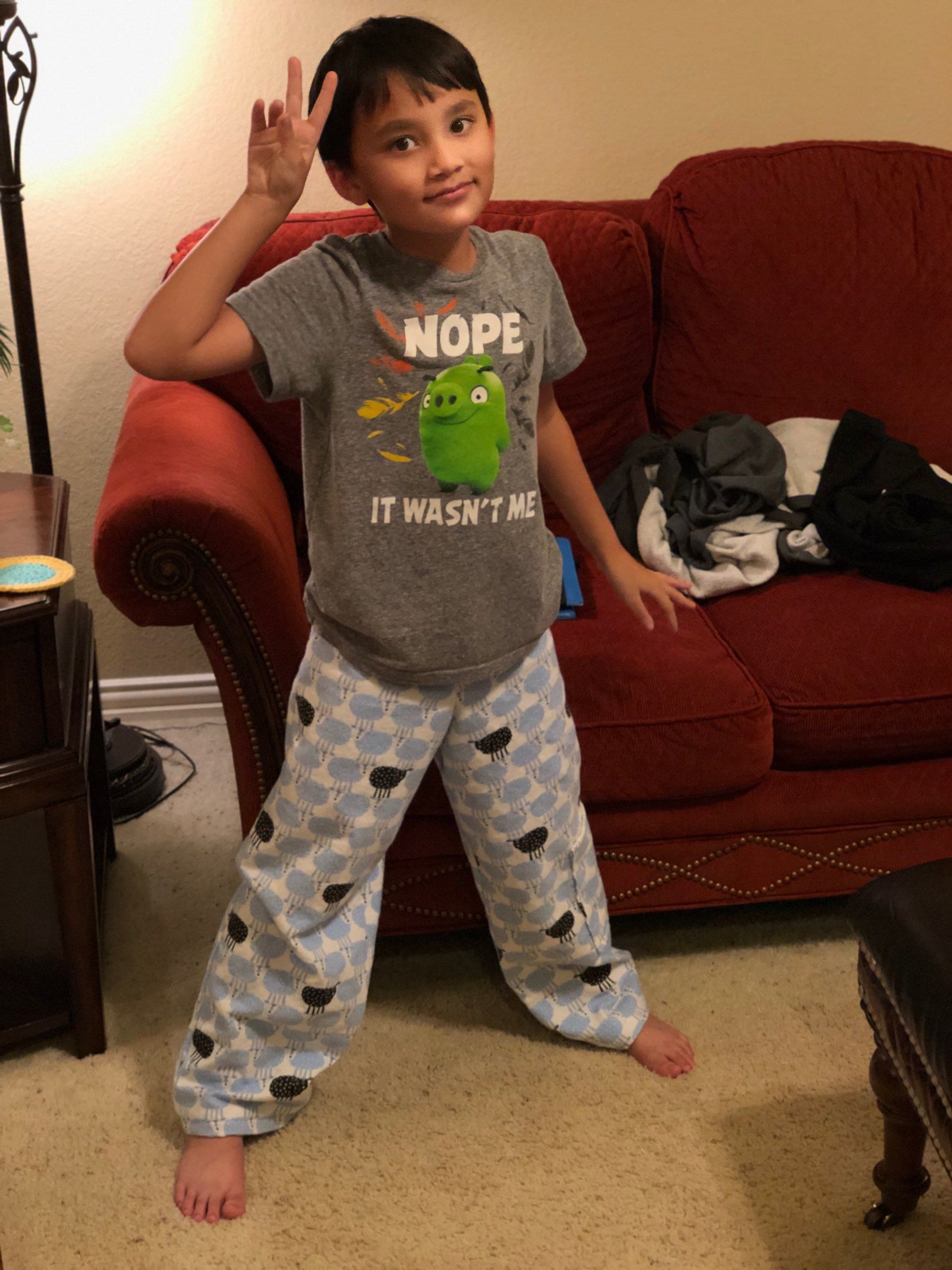 My wife got a sewing machine and is learning how to make clothes. Here our son models Mom’s first ever pajama pants. 📷 🧵 👖
