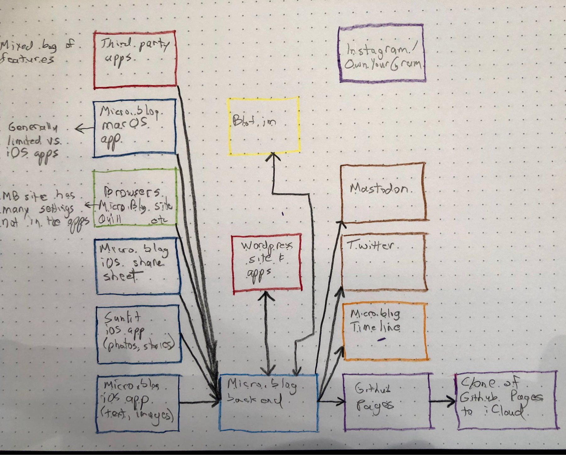 There are a lot of pieces and connections (some required, some optional) for users adopting Micro.Blog. As a new user back in January I was often a bit muddled about the relationships. I decided to map out the ones I’m aware of. I’ve used many of these myself.