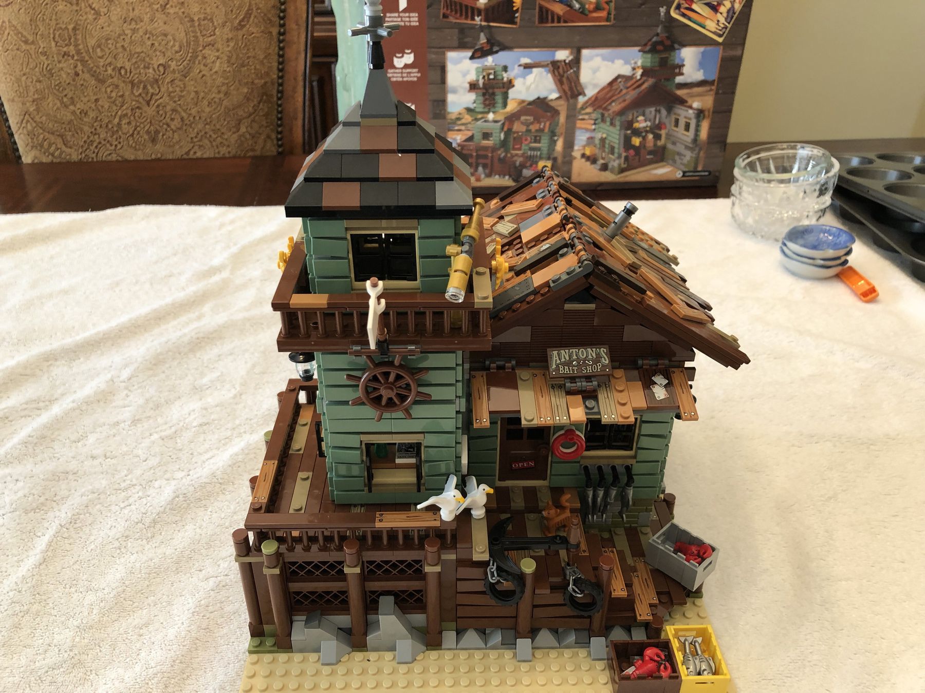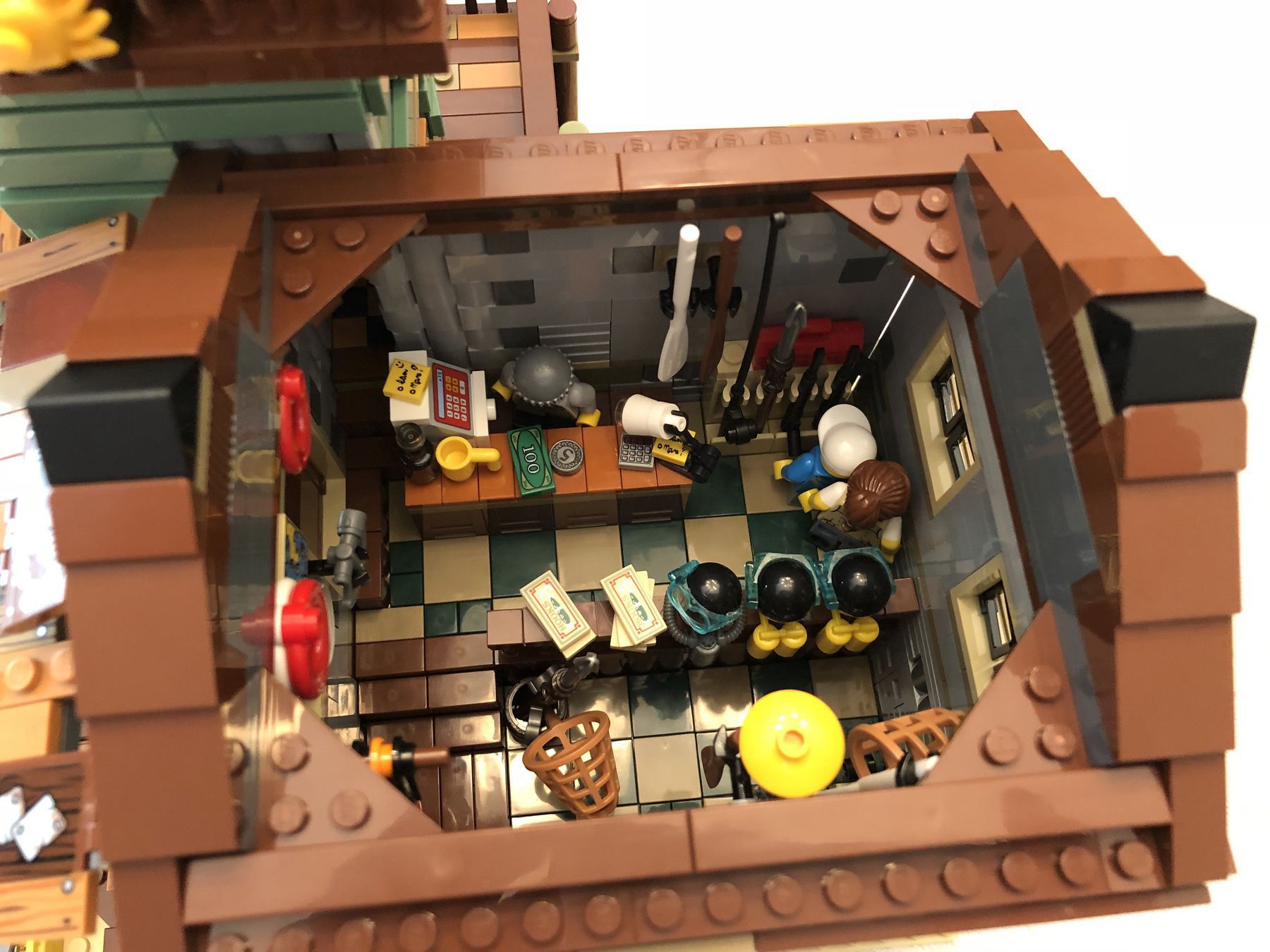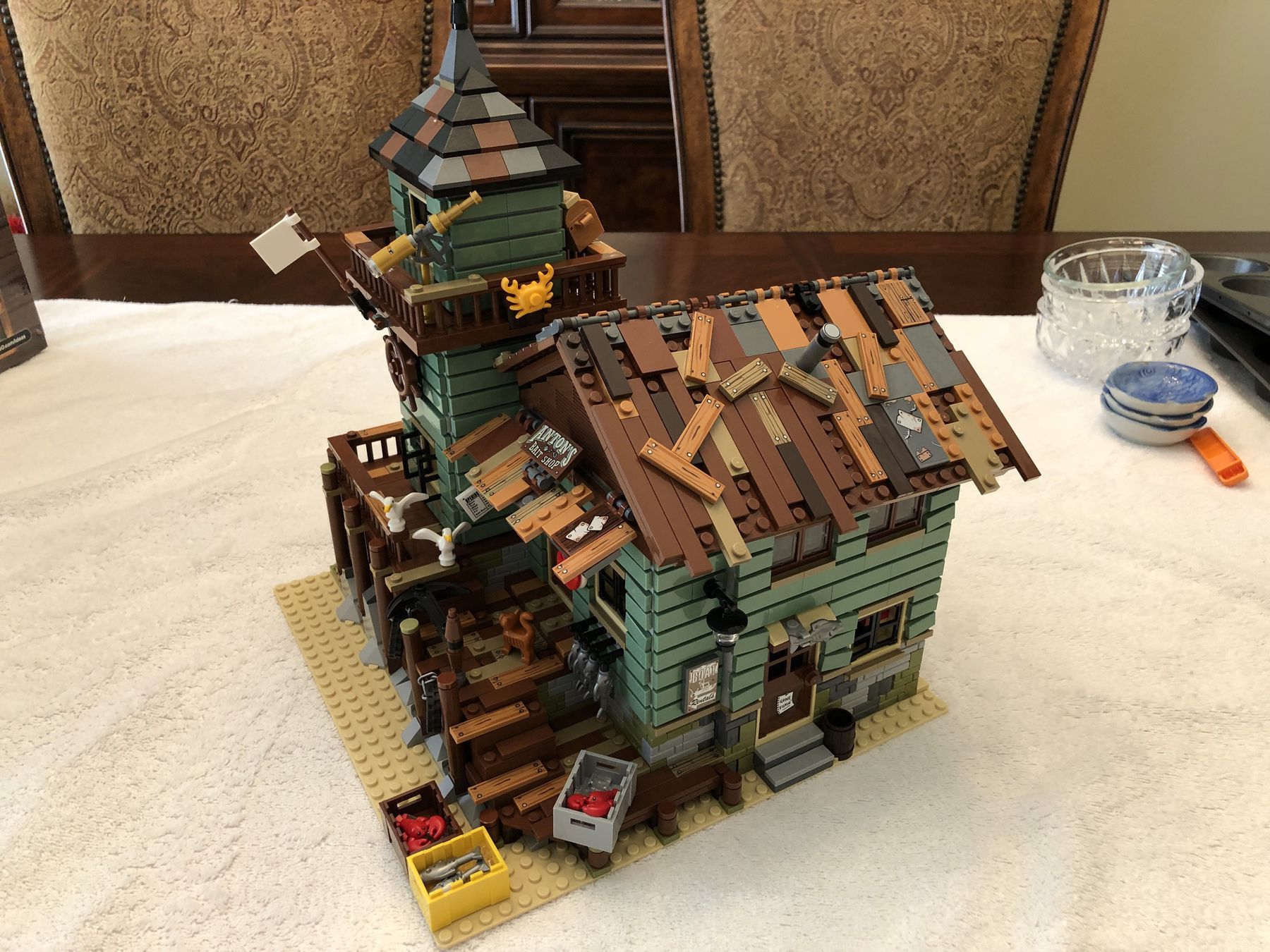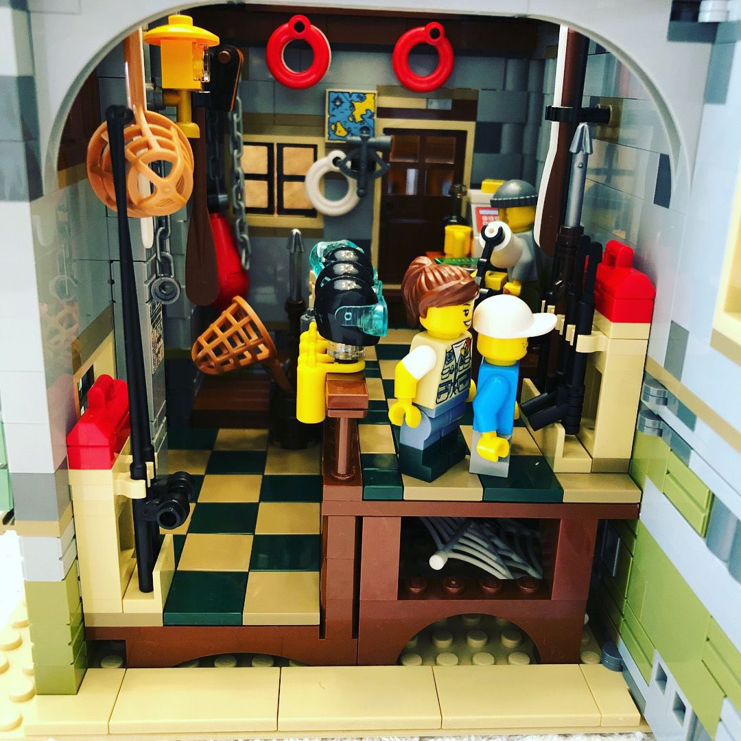 My 9 year old son and I just finished building the Old Fishing Store that I received as a Christmas gift. It isn’t that large but since it has a ton of detail there are over 2,000 pieces. There are two removable roofs allowing access to the rooms inside the store and also two walls that swing open for the same purpose. It is one of the more playable sets, in my opinion, because it comes with a ton of loose accessories such as crabs, lobsters, scuba gear, seagulls, chests with fishing gear, TNT (!?!) and other items.
