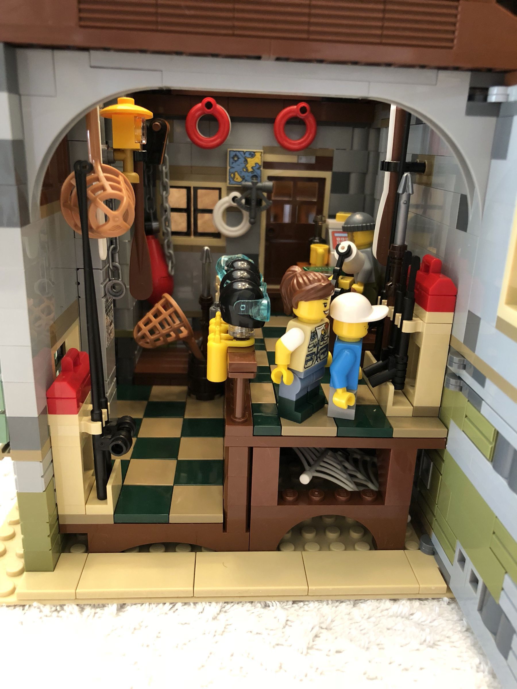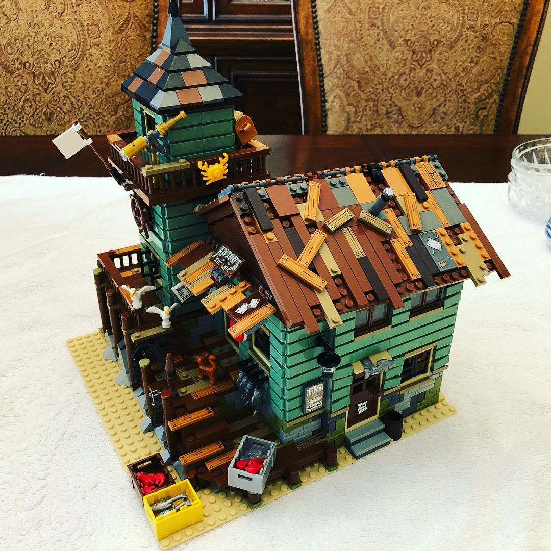My 9 year old son and I just finished building the Old Fishing Store that I received as a Christmas gift. It isn’t that large but since it has a ton of detail there are over 2,000 pieces. There are two removable roofs allowing access to the rooms inside the store and also two walls that swing open for the same purpose. It is one of the more playable sets, in my opinion, because it comes with a ton of loose accessories such as crabs, lobsters, scuba gear, seagulls, chests with fishing gear, TNT (!?!) and other items.