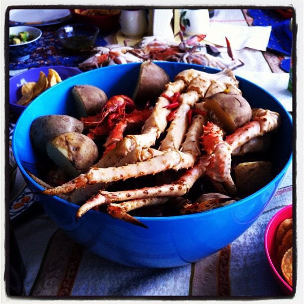 King crab, blue crab, crawfish, potato